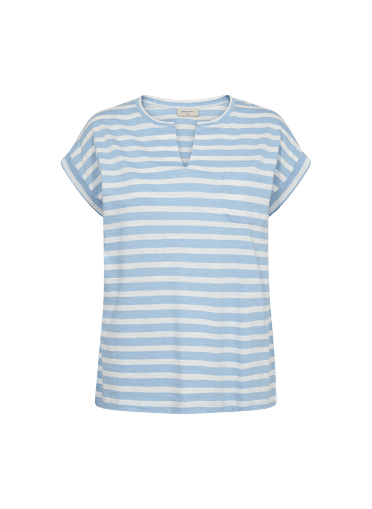 Dit casual lichtblauw en wit gestreepte shirt is een must-have voor je garderobe. Het heeft een ronde halslijn met een subtiele V-vormige inkeping, waardoor het een stijlvolle en moderne uitstraling heeft. De korte mouwen zijn licht opgerold, wat bijdraagt aan de ontspannen look. De kleine borstzak voegt een praktisch detail toe zonder de eenvoudige elegantie van het shirt te verstoren. Gemaakt van een zachte en comfortabele stof, bestaande uit 50% katoen en 50% biologisch katoen, is dit shirt perfect voor verschillende casual gelegenheden. Combineer het met een comfortabele chino of een lichte jeans voor een moeiteloze, maar modieuze look.