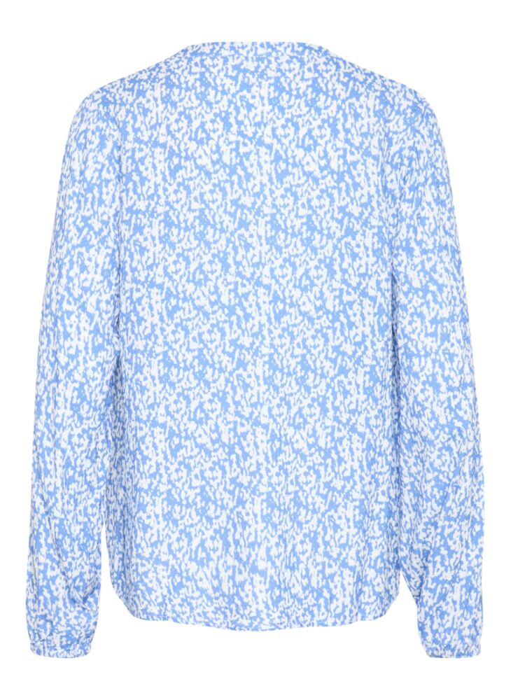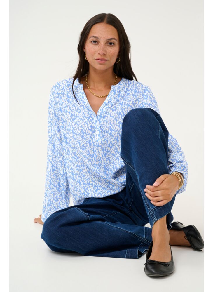 Upgrade je basisgarderobe met deze prachtige viscose blouse van Kaffe. Deze blouse combineert comfort en stijl dankzij de hoogwaardige, ademende viscose stof. Ontworpen met een losvallende pasvorm, lange mouwen en een stijlvolle V-halslijn, biedt deze blouse een casual en comfortabele look die perfect is voor elke dag. De subtiele lichtblauwe en witte patronen voegen een frisse, moderne touch toe aan je outfit. Deze blouse is ideaal om los buiten de broek te dragen dankzij de perfecte lengte – niet te lang en niet te kort. Combineer hem met je favoriete broek of rok voor een veelzijdige en stijlvolle look.