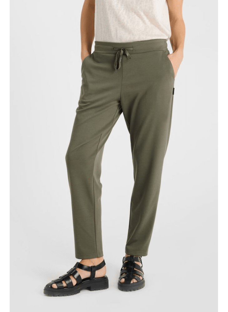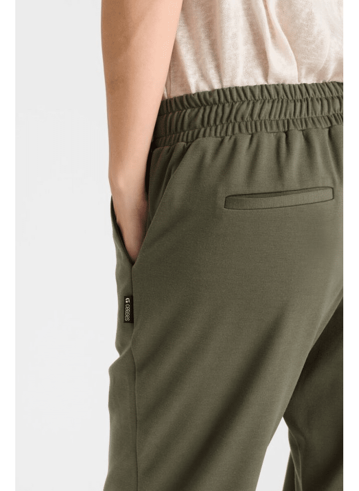 Pantalon droit en jersey souple, taille élastiquée au dos, et cordon brillant à nouer à la taille, poches italiennes.