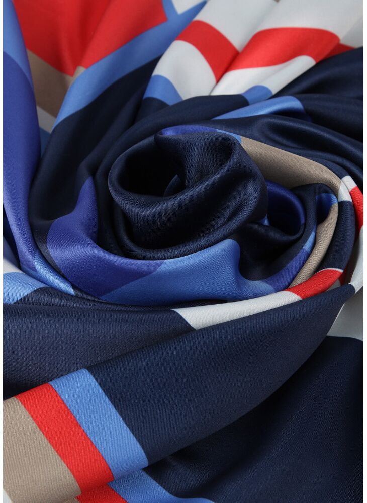 Scarf made of satin fabric. Colourful stripe print detail with central logo and Greek key logo border. Measurements: 90 cm x 90 cm.