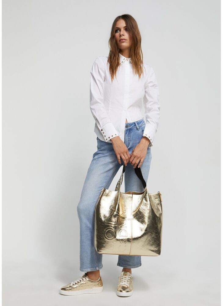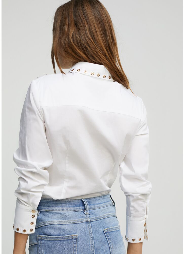 Fitted shirt. Metal studs on the collar and shirt cuffs. Fastening with buttons hidden by a placket.