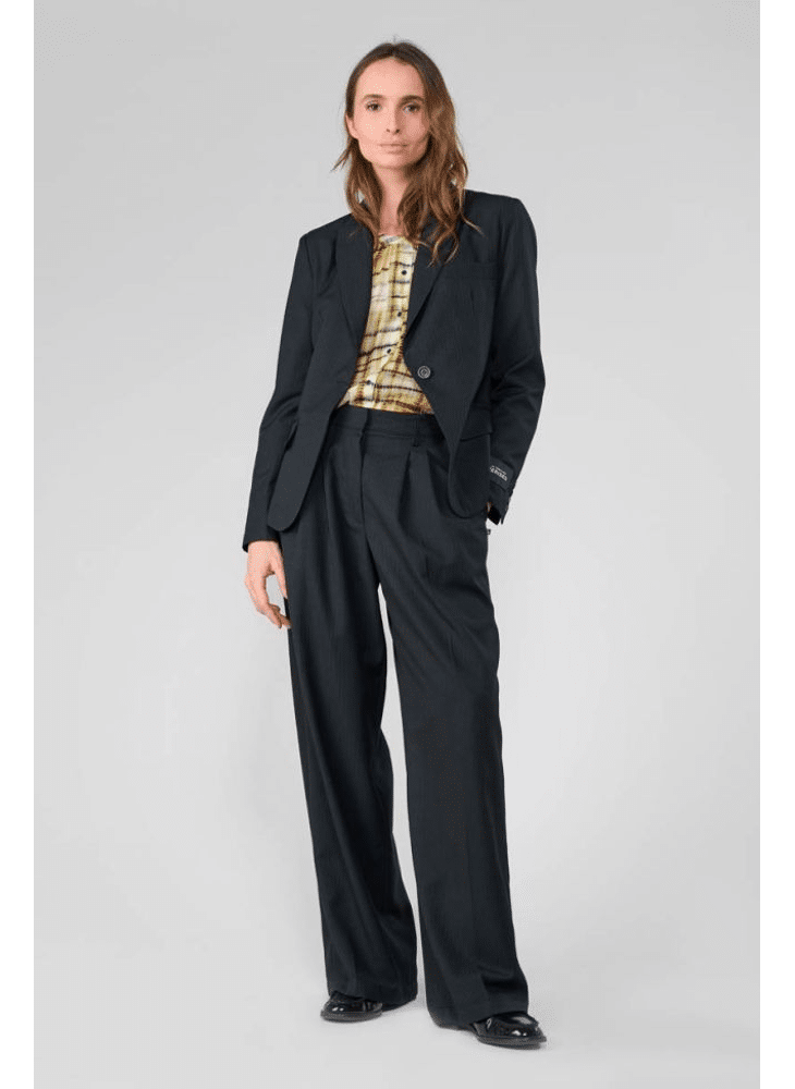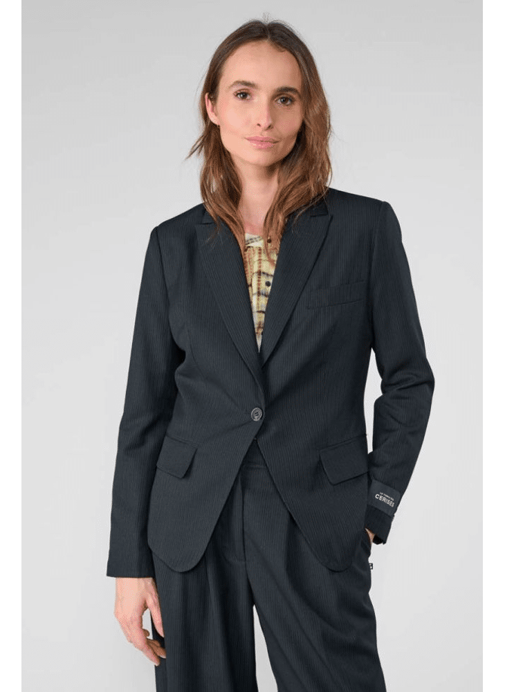 This Evera blazer jacket is chic and elegant with its slim-fit blazer cut, black fabric with fine white stripes, epaulettes and front patch pockets. For added comfort, the jacket is lined and has an inside pocket and front button closure.